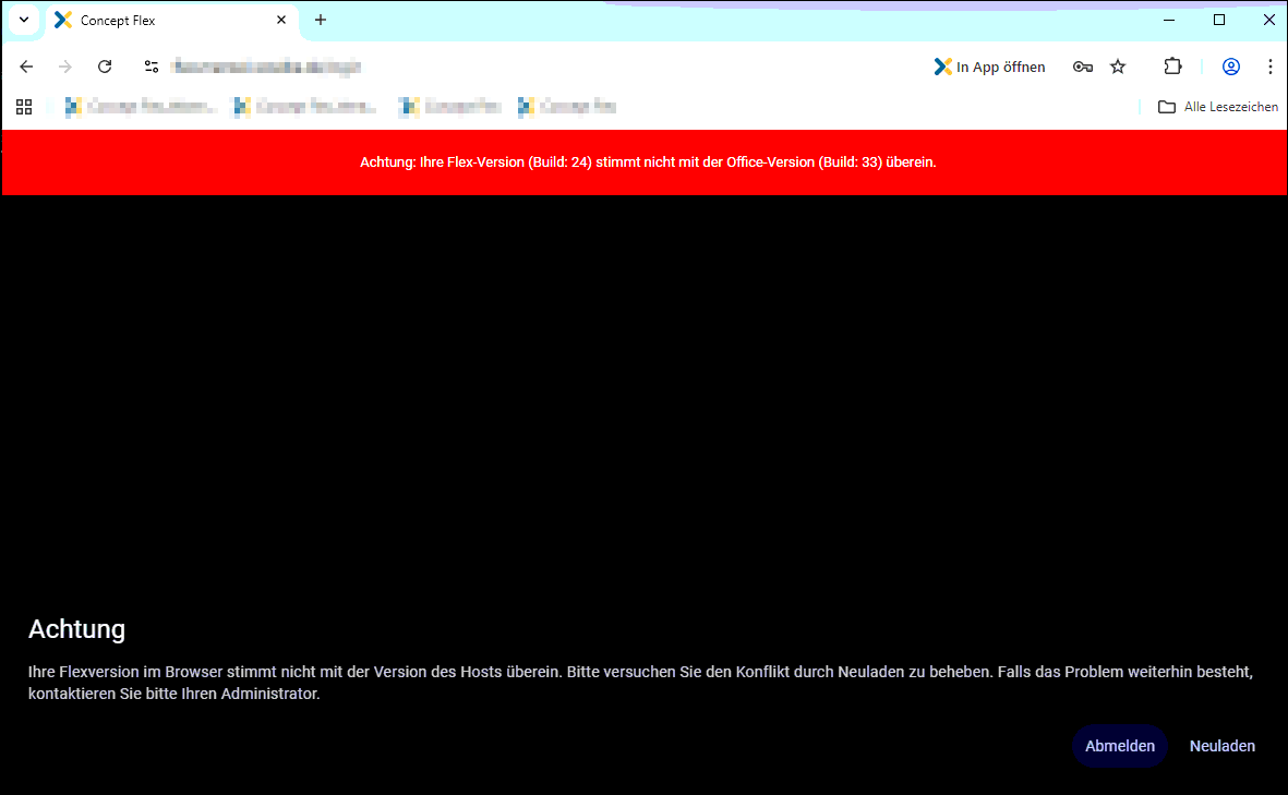 Darunter erscheint die Meldung: "Achtung Ihre Flexversion im Browser stimmt nicht mit der Version des Hosts überein. Bitte versuchen Sie den Konflikt durch Neuladen zu beheben. Falls das Problem weiterhin besteht, kontaktieren Sie bitte Ihren Administrator."