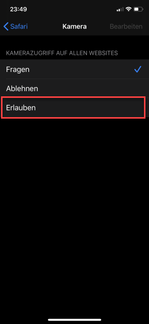Bei mobilen Geräten von Apple kann der Zugriff auf die Kamera für den Browser in den Einstellungen festgelegt werden...: