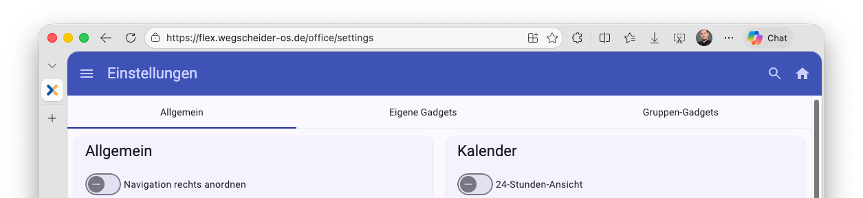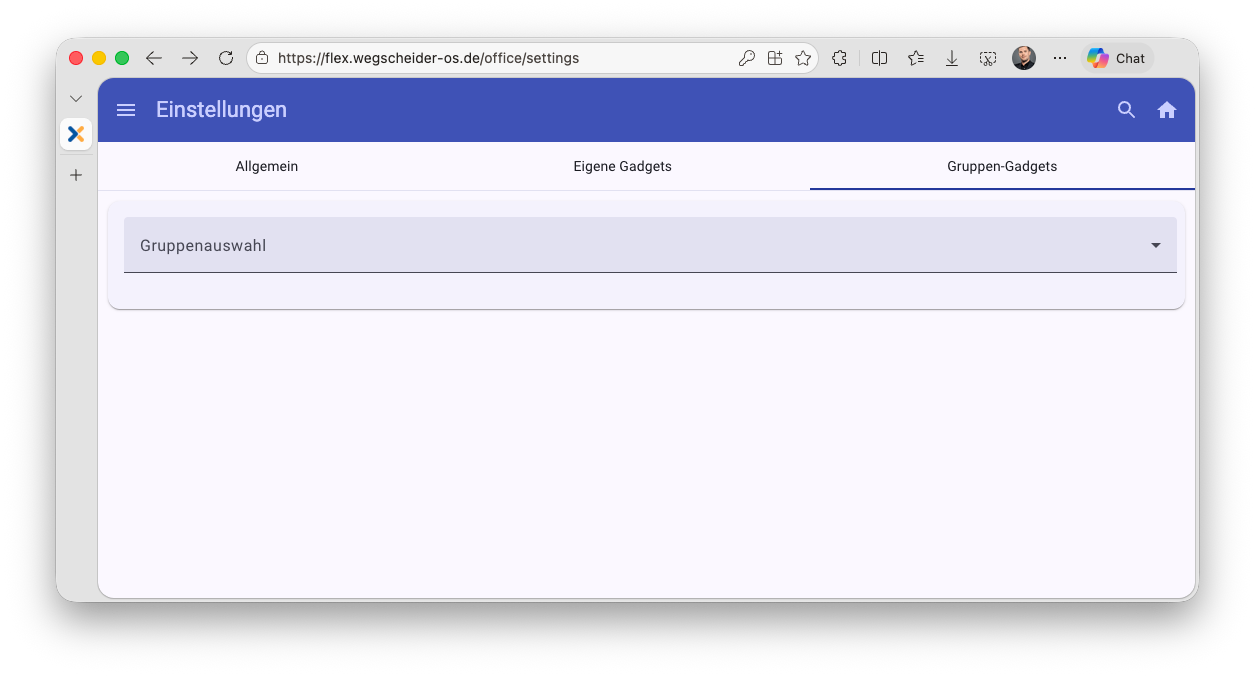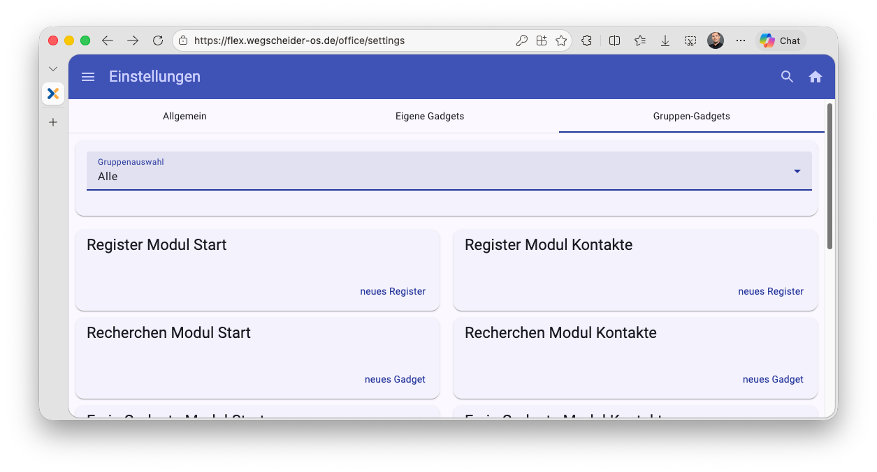 Im Concept Flex Modul "Einstellungen" finden Sie im oberen Bereich die Reiter "Eigene Gadgets" und "Gruppen-Gadgets":
