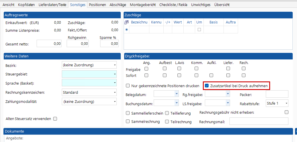 Für am Geschäftsbereich hinterlegte Artikel kann eingestellt werden, dass diese erst beim Druck eingefügt werden. - Diese Zusatzartikel werden beim Druck als Auftragsposition hinzugefügt.