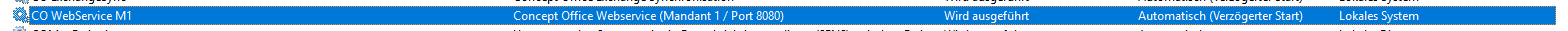 Um die korrekte Lizenzzählung auch in Concept Flex zu gewährleisten, ist ein Neustart des Flex-Dienstes notwendig, sofern ein Concept Flex an das Concept Office angeschlossen ist. Suchen Sie hierfür auf Ihrem entsprechendem Server nach dem Dienst CO WebService M(die Zahl des aktiven Mandanten) und starten diesen neu.