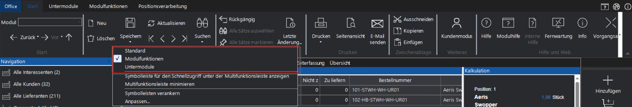 Es ist möglich die Modulleiste in Concept Office im Reiter Positionen individuell ein- oder auszublenden. Um die Modulfunktionen ein- oder auszublenden drücken Sie bitte im oberen Bereich, z.B. in der Registerkarte Start, die rechte-Maus Taste.