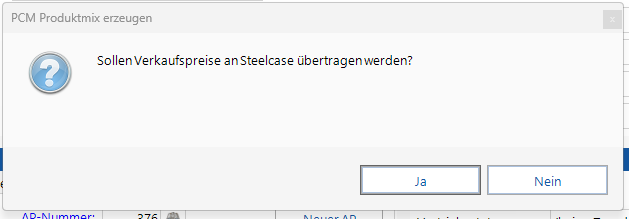Es erfolgt eine Abfrage, ob zusätzlich auch die Verkaufspreise an Steelcase übermittelt werden sollen. Klickt der Anwender auf "Ja", so werden in der dann genehmigten Rahmenvertragsvereinbarung auch die Verkaufskonditionen mitgeliefert.