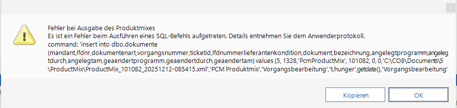 command: 'insert into dbo.dokumente(mandant,lfdnr,dokumentenart,vorgangsnummer,ticketid,lfdnummerlieferantenkondition,dokument,bezeichnung,angelegtprogramm,angelegtdurch,angelegtam,geaendertprogramm,geaendertdurch,geaendertam) values (5, 1324,'PcmProductMix', 101089, 0, 0,'C:\CO8\Documents\5\ProductMix\ProductMix_101089_20251211-114201.xml','PCM Produktmix','Vorgangsbearbeitung','t.hunger',getdate(),'Vorgangsbearbeitung','t.hunger',getdate())' (Server/Database: 045nb2/scoffice8) ---> System.Data.SqlClient.SqlException: Die INSERT-Anweisung steht in Konflikt mit der FOREIGN KEY-Einschränkung "FK_Dokumente_DokumentenArt". Der Konflikt trat in der scoffice8-Datenbank, Tabelle "dbo.DokumentenArten" auf.