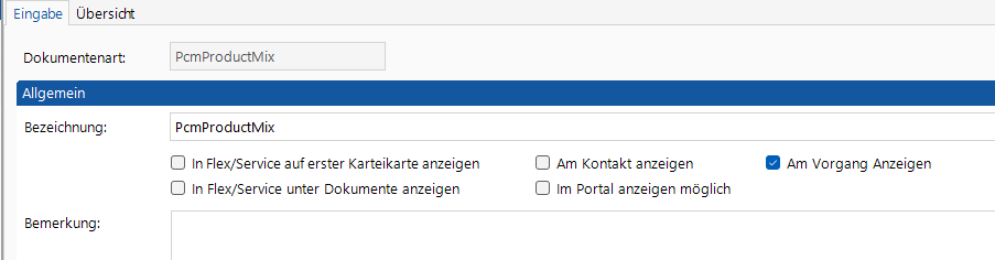 Unter "Weitere Stammdaten / Dokumentenarten" ist eine neuen Dokumentenart mit der Bezeichnung "PcmProductMix" anzulegen (inkl. der Eigenschaft "Am Vorgang anzeigen").