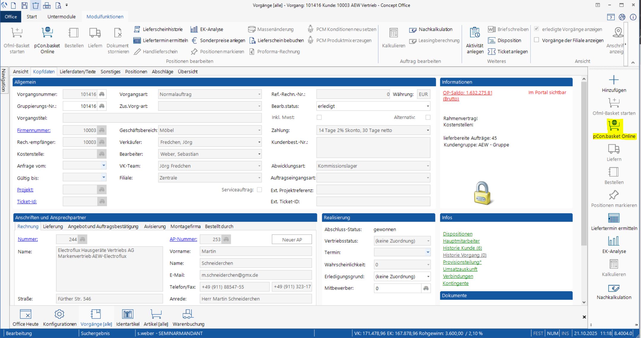 1. Das Leserecht für die Module Vorgänge und Angebotsbearbeitung  - der pCon.basket Online ist hier generell noch nicht im Lesemodus startbar.