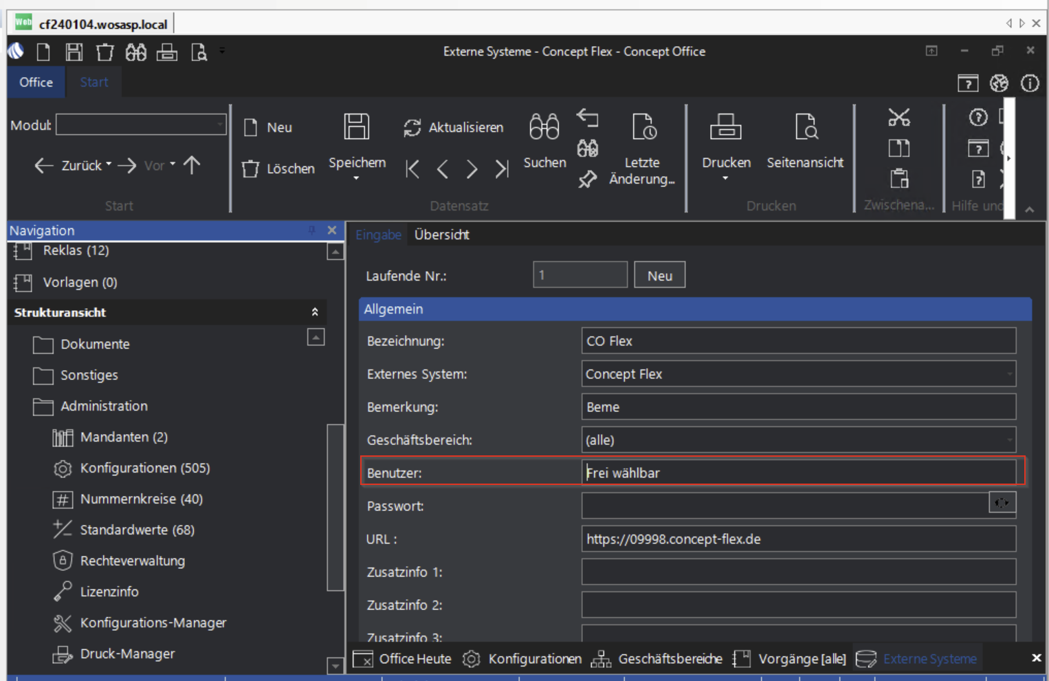 Bevor Sie die Vorgangssicht in Concept Office nutzen können, muss Concept Flex in Concept Office als Externes System ergänzt werden. Wechseln Sie hierfür im Bereich Administration in das Modul ''Externe Systeme''. Hier können Sie nun über den NEU-Button Concept Flex als externes System hinzufügen. Folgende Felder müssen befüllt werden: