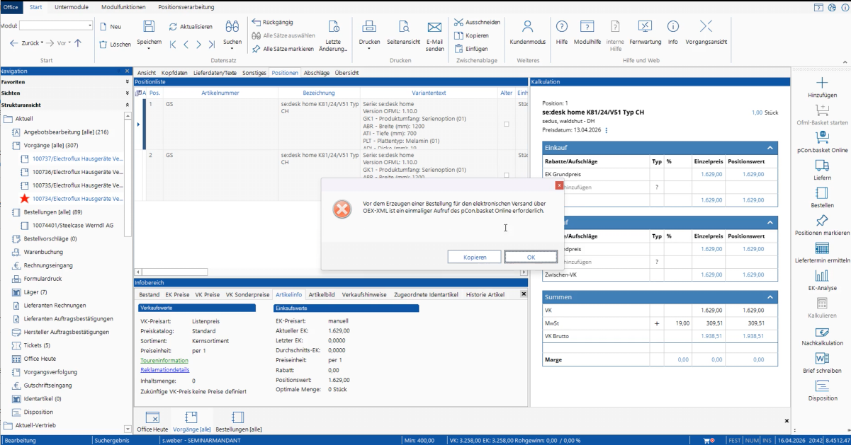 - Beim Klick auf "Bestellung erzeugen" im Vorgang fordert eine Meldung auf, zunächst den pCon.basket Online zu starten.