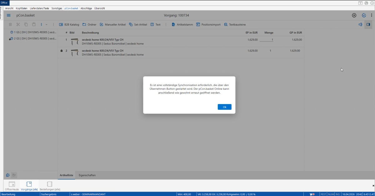 - Beim Starten des pCon.basket Online erscheint ein Hinweis, dass eine Positionsübernahme ausgeführt werden muss.