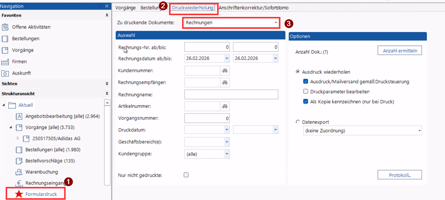 Damit Sie allerdings nicht die komplette Rechnung stornieren müssen und eine neue Rechnung erstellen müssen, mit einer neuen Rechnungsnummer, gibt es die Möglichkeit, über den Formulardruck einen Wiederholungsdruck auszulösen, bei dem Concept Office alle aktuellen Informationen wie beispielsweise die Umsatzsteuer-ID, falls diese vergessen wurde, berücksichtigt.
