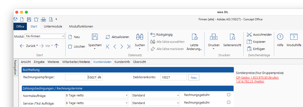 Sind an einem Kunden Offene Posten hinterlegt, werden diese, durch rote Schrift sofort erkennbar, am Kontakt- und Vorgangsmodul angezeigt.