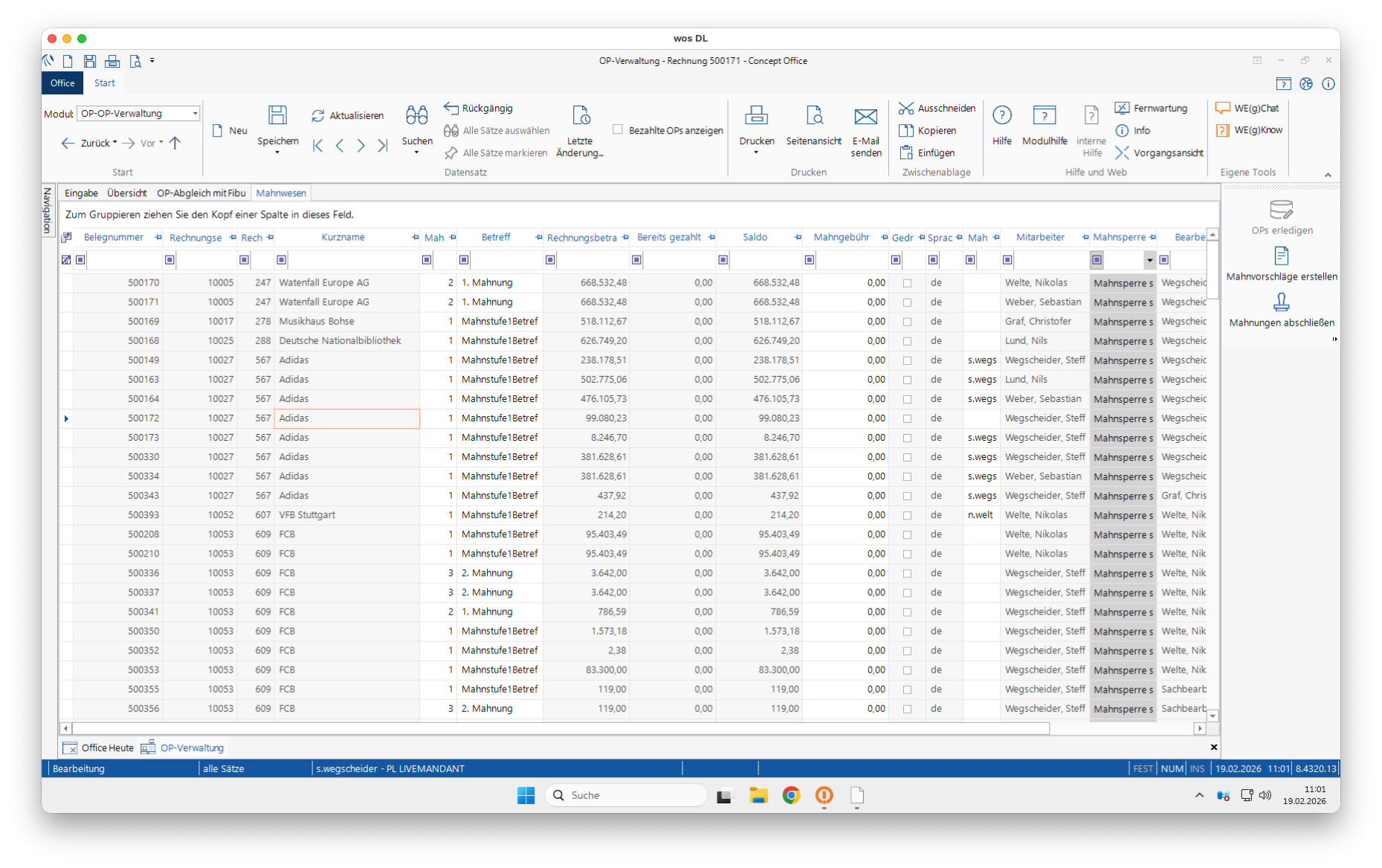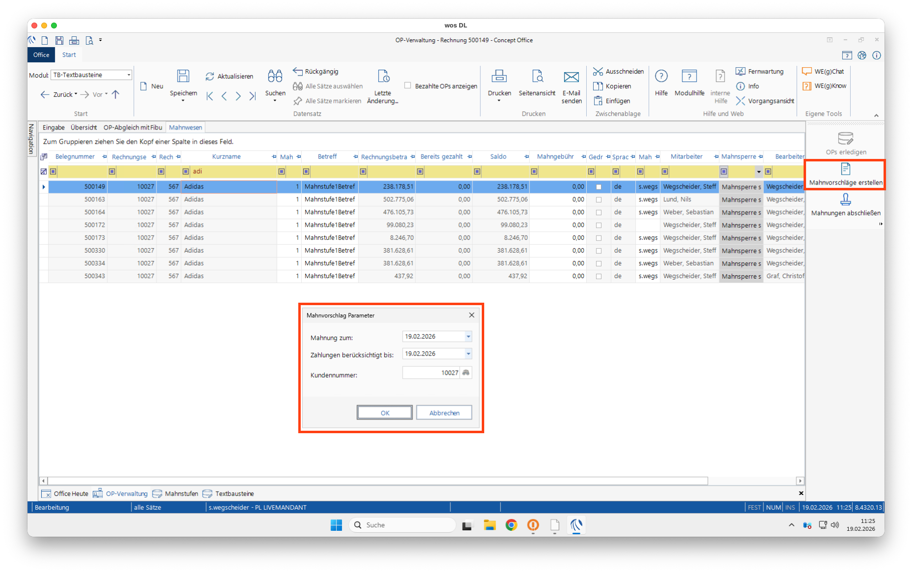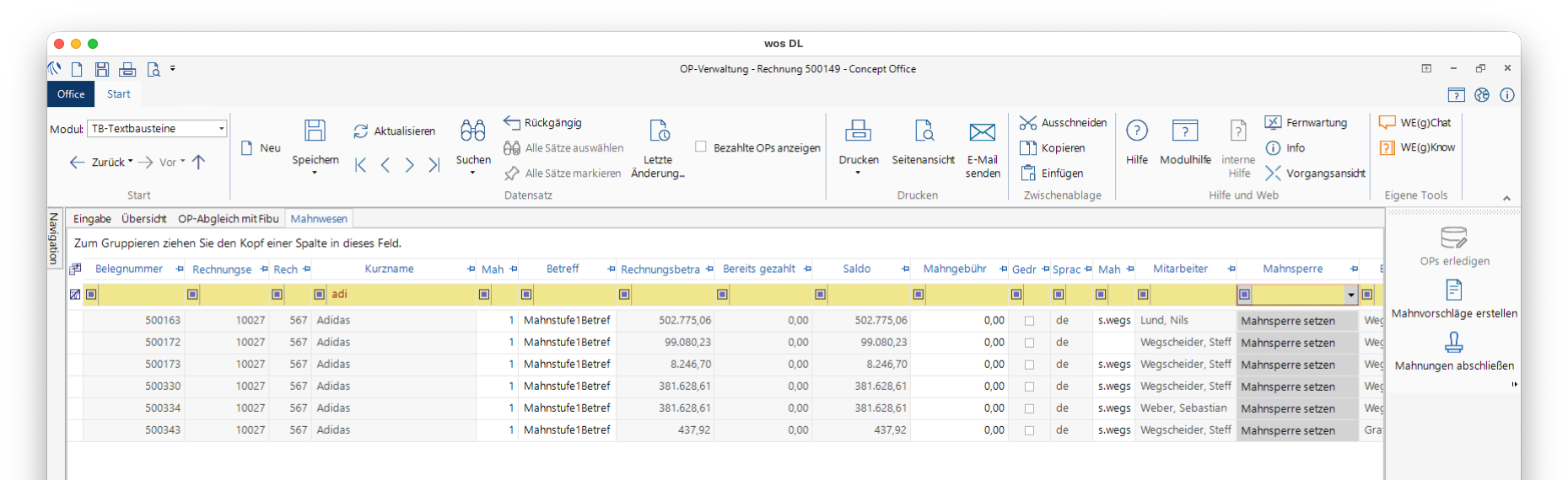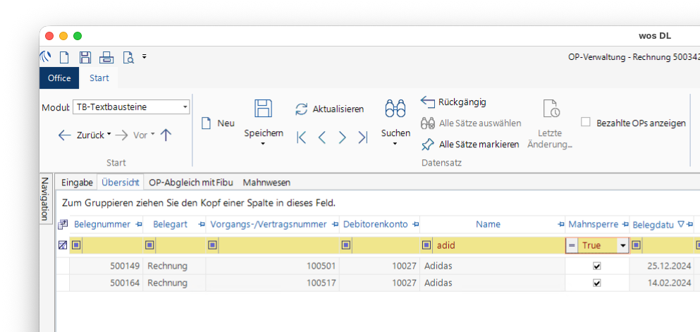 Öffnen Sie im Modul OP‑Verwaltung in den Reiter Mahnwesen, es werden alle überfälligen Belege angezeigt.