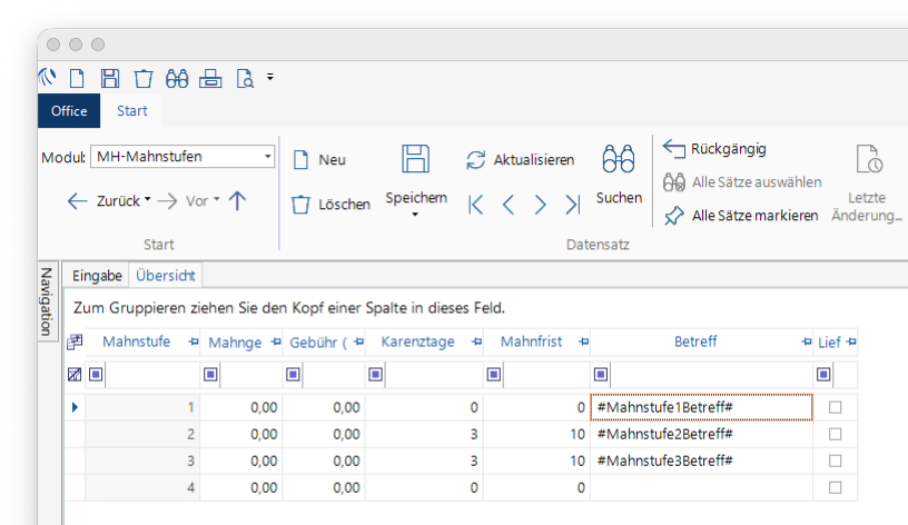 Pro Mahnstufe kann eine eigene Mahnfrist und die Karenztage hinterlegt werden (Tage bis zur nächsten Stufe plus Karenztage (z. B. 10 Tage + 2 Karenztage).