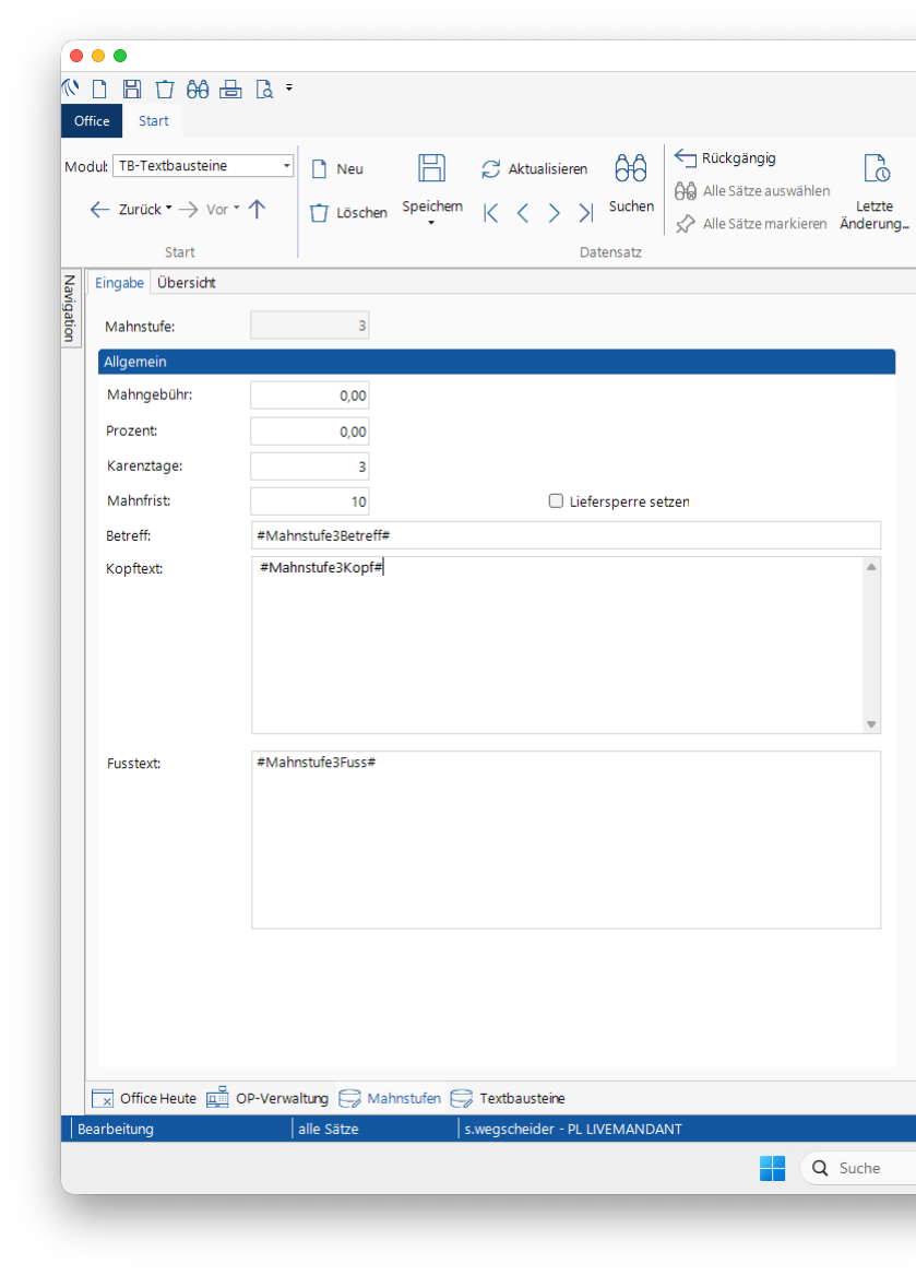 Im Mahnwesen werden Mahnvorschläge basierend auf der OP-Verwaltung erzeugt und Mahnungen per Druck oder E‑Mail ausgegeben. Das Mahnwesen ist ein eigener Reiter im Modul "OP-Abgleich":