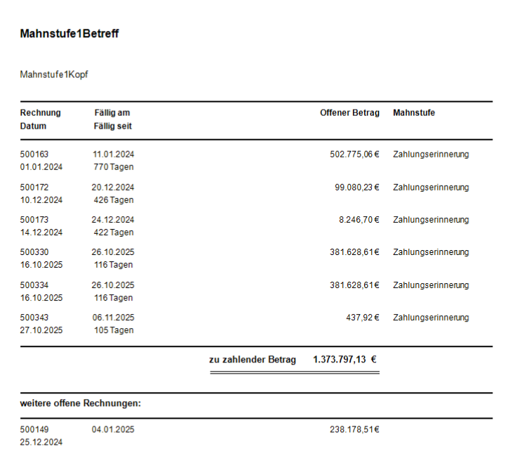 Die Ausgabe erfolgt typischerweise pro Kunde als Dokument mit den offenen Belegen. Weitere offene Rechnungen (noch nicht zwingend mahnreif) können im Dokument ebenfalls aufgeführt werden.