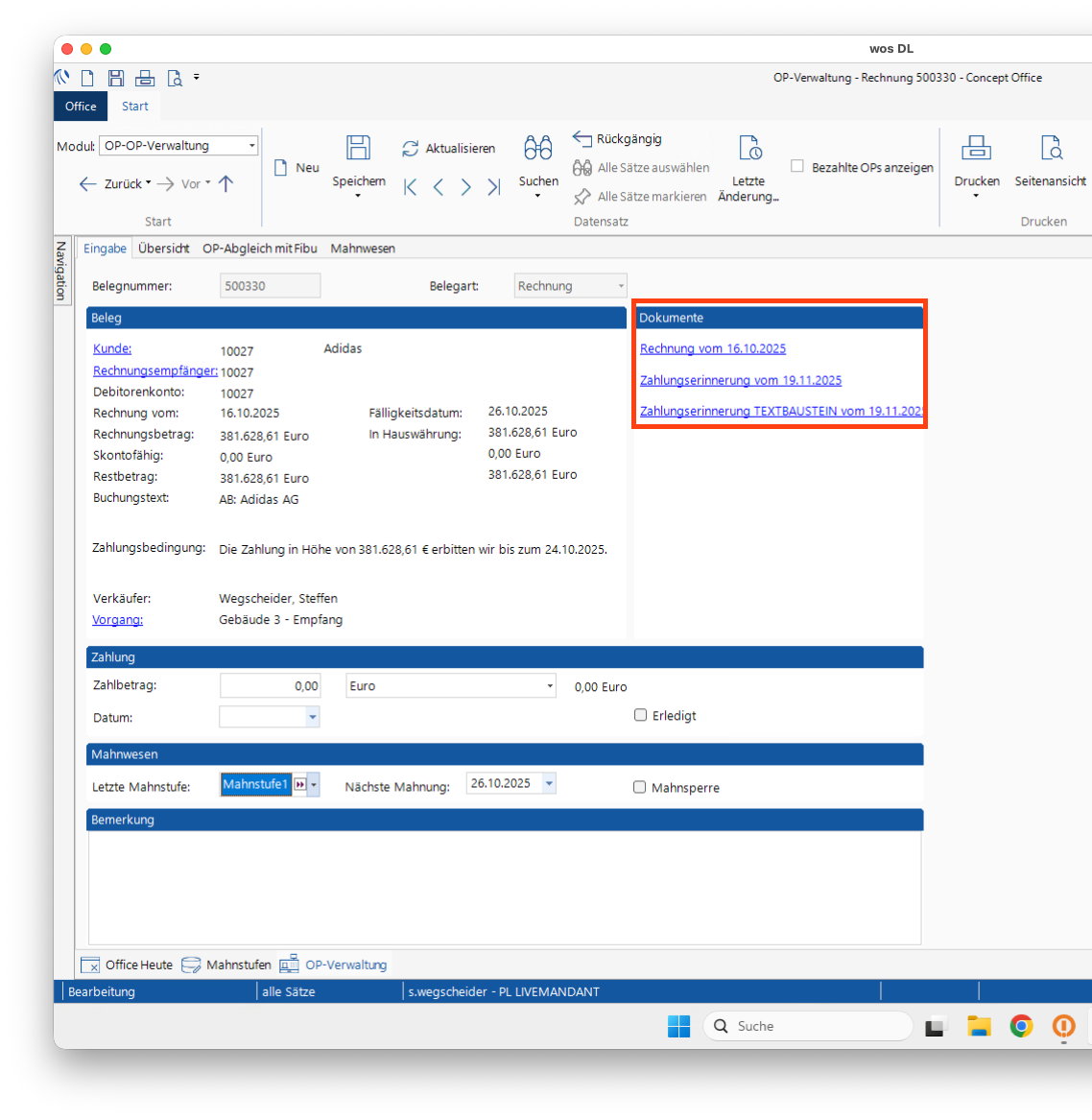 Nach der Erzeugung einer Mahnung, wird im Beleg (Reiter Eingabe) der OP-Verwaltung eine Beleghistorie im Bereich Dokumente erzeugt: