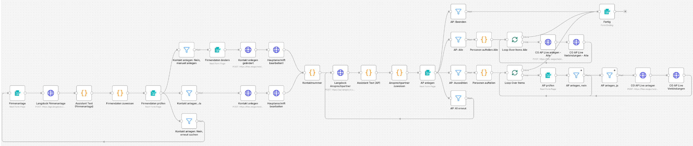 Wie im Schaubild erkennbar, ist der tatsächliche Workflow im Hintergrund deutlich komplexer (u. a. Prüfungen, Textumwandlungen, Schleifen/Iterationen und weitere Verarbeitungsschritte):