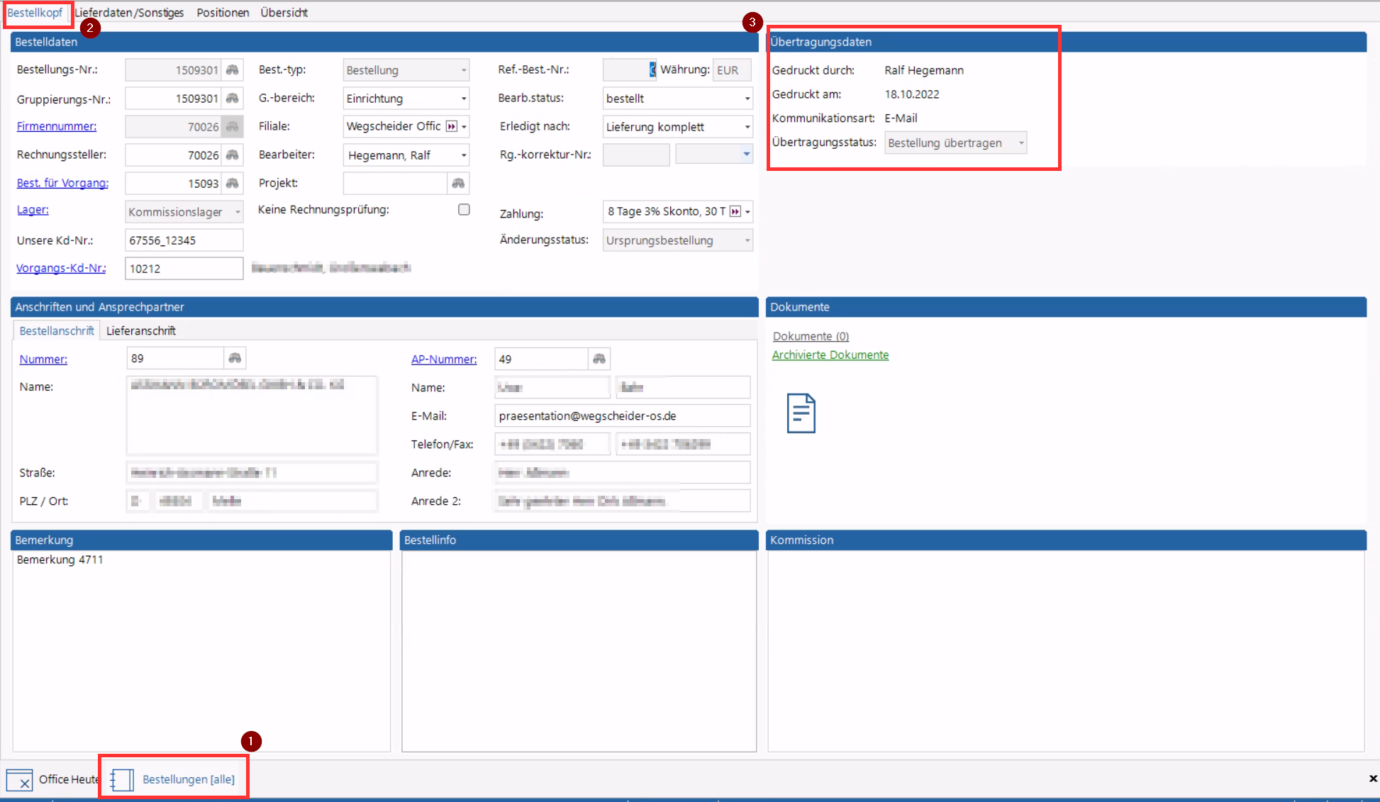Um zu erkennen, ob eine elektronische Bestellung korrekt an den jeweiligen Hersteller versendet wurde, öffnen sie die jeweilige Bestellung im Bestellmodul.