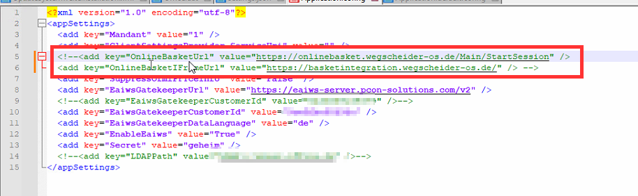 Hier ist es notwendig in der Application.config die beiden Einträge der Onlinebasket-URL und iFrame-URL auszukommentieren: