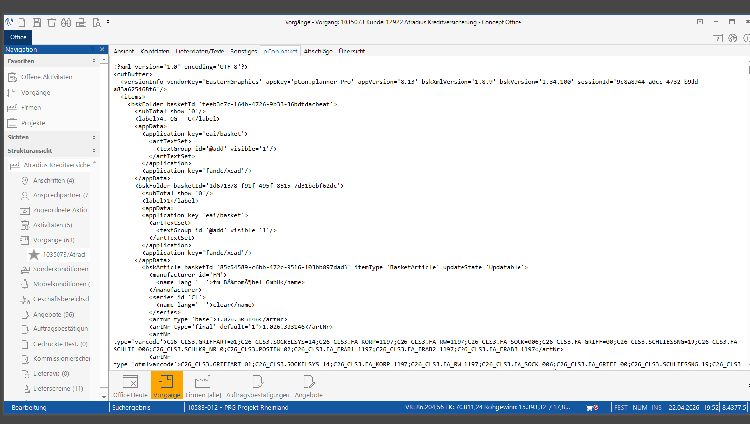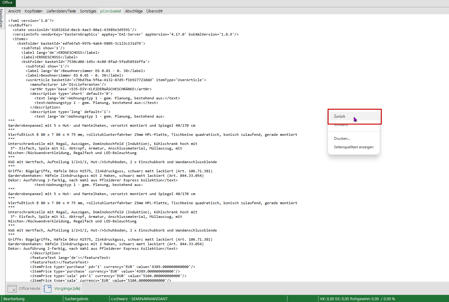 Der Inhalt wird nicht wie erwartet geladen, stattdessen erscheint eine kryptische Ansicht (Quellcode). In diesem Zustand lässt sich der Basket nicht mehr bearbeiten oder schließen. Ein normales Weiterarbeiten ist nicht möglich.