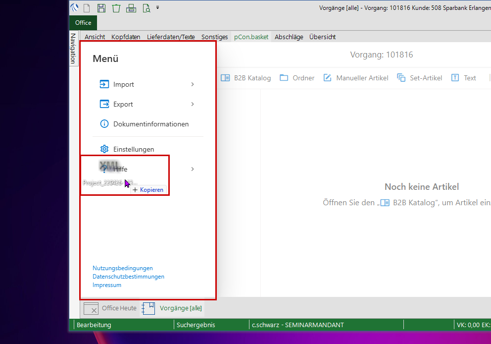 - Im pCon.basket Online einen Rechtsklick ausführen.