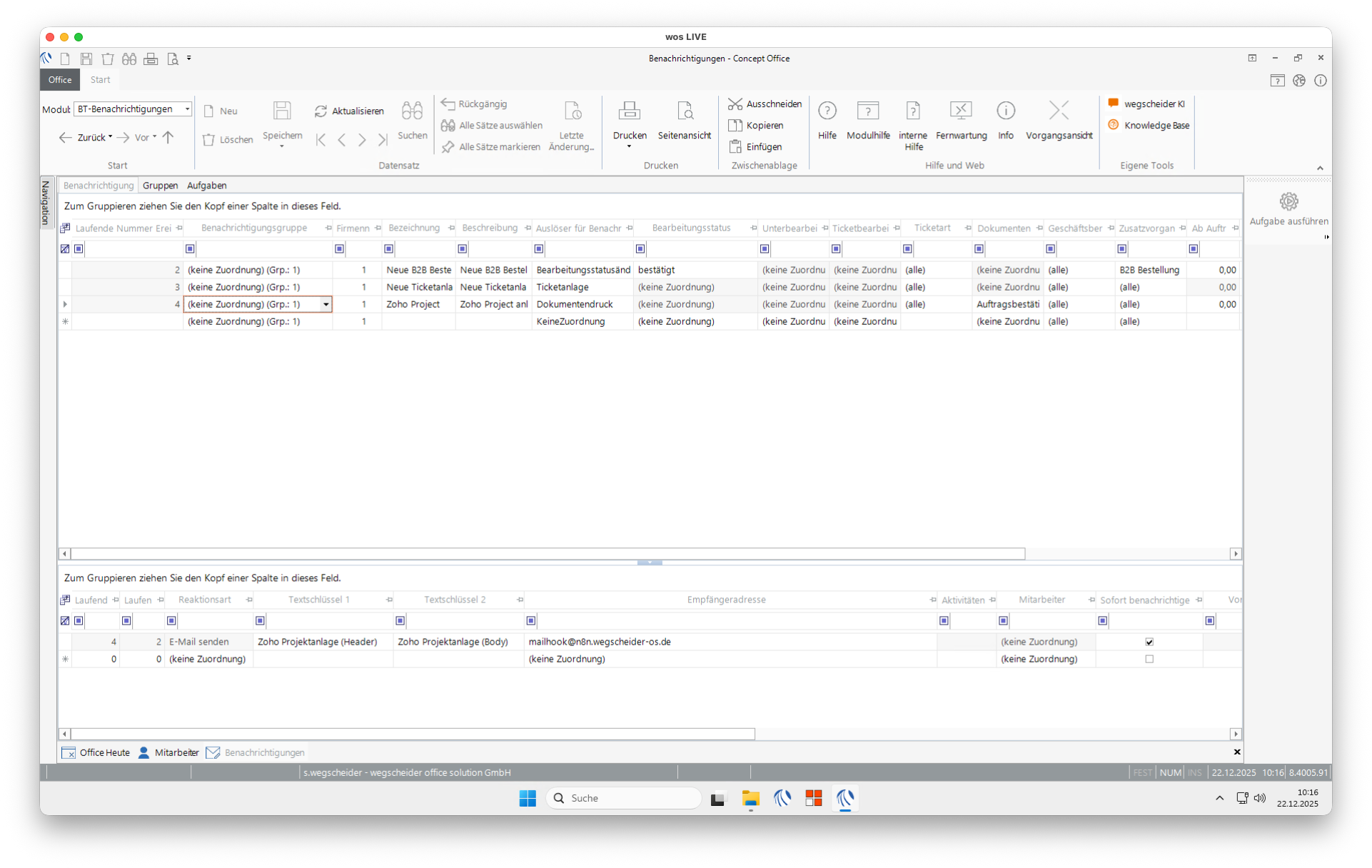 Das Modul „Benachrichtigungen“ in Concept Office dient dazu, automatisierte Mitteilungen an Kunden, eigene Mitarbeiter oder Techniker zu versenden. Diese Mitteilungen informieren über bestimmte Ereignisse oder Zustände im System – beispielsweise über Auftragsänderungen, abgeschlossene Serviceaufträge, neue Aufgaben oder andere definierte Vorgänge. Ziel der Funktion ist es, relevante Informationen schnell, zuverlässig und ohne manuellen Aufwand an die richtigen Personen weiterzugeben. Dadurch können interne Abläufe effizienter gestaltet, Reaktionszeiten verkürzt und Kommunikationsfehler vermieden werden.