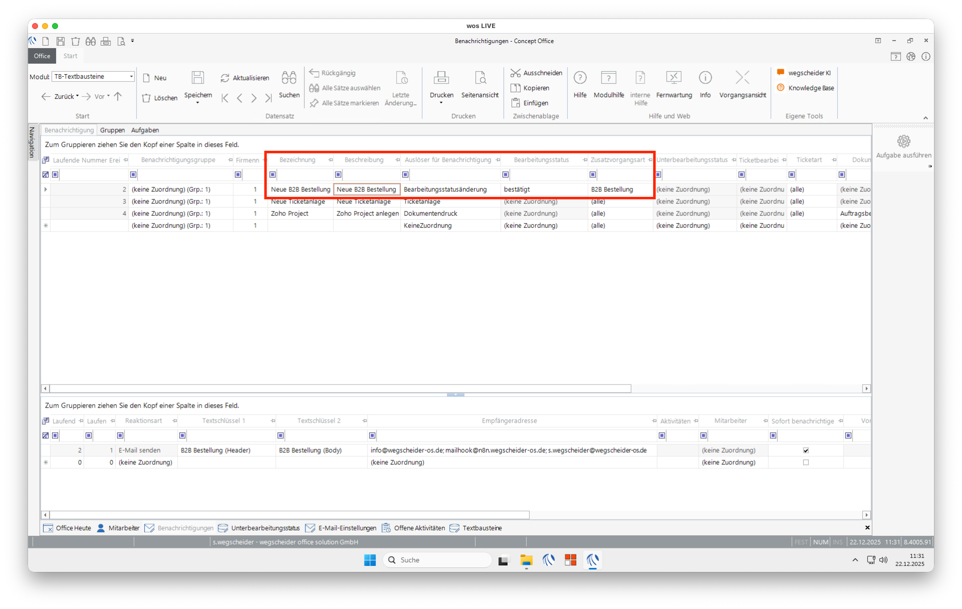 Im folgenden Beispiel möchten wir eine E-Mail versenden, wenn eine neue Concept B2B Bestellung übermittelt wurde, die folgenden Felder müssen hierzu befüllt werden: