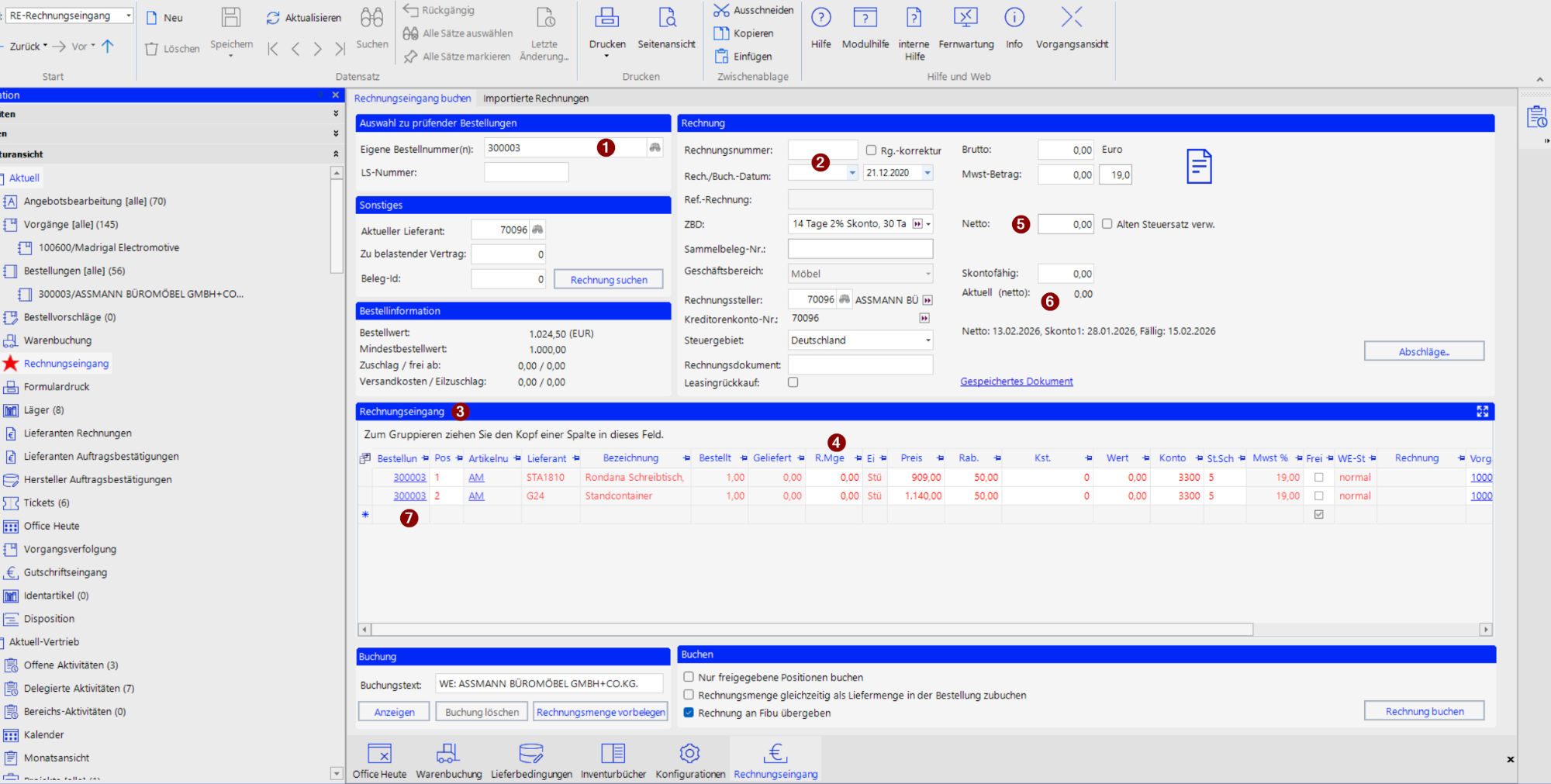 Anschließend werden Rechnungsnummer und -datum in das entsprechende Feld eingetragen (2&3). Im Bereich "Rechnungseingang" (3) finden sich die Positionen der Bestellung. Sind diese Positionen in rot dargestellt, so ist noch kein Wareneingang für diese Positionen erfolgt. Die Rechnung kann trotzdem gebucht werden.