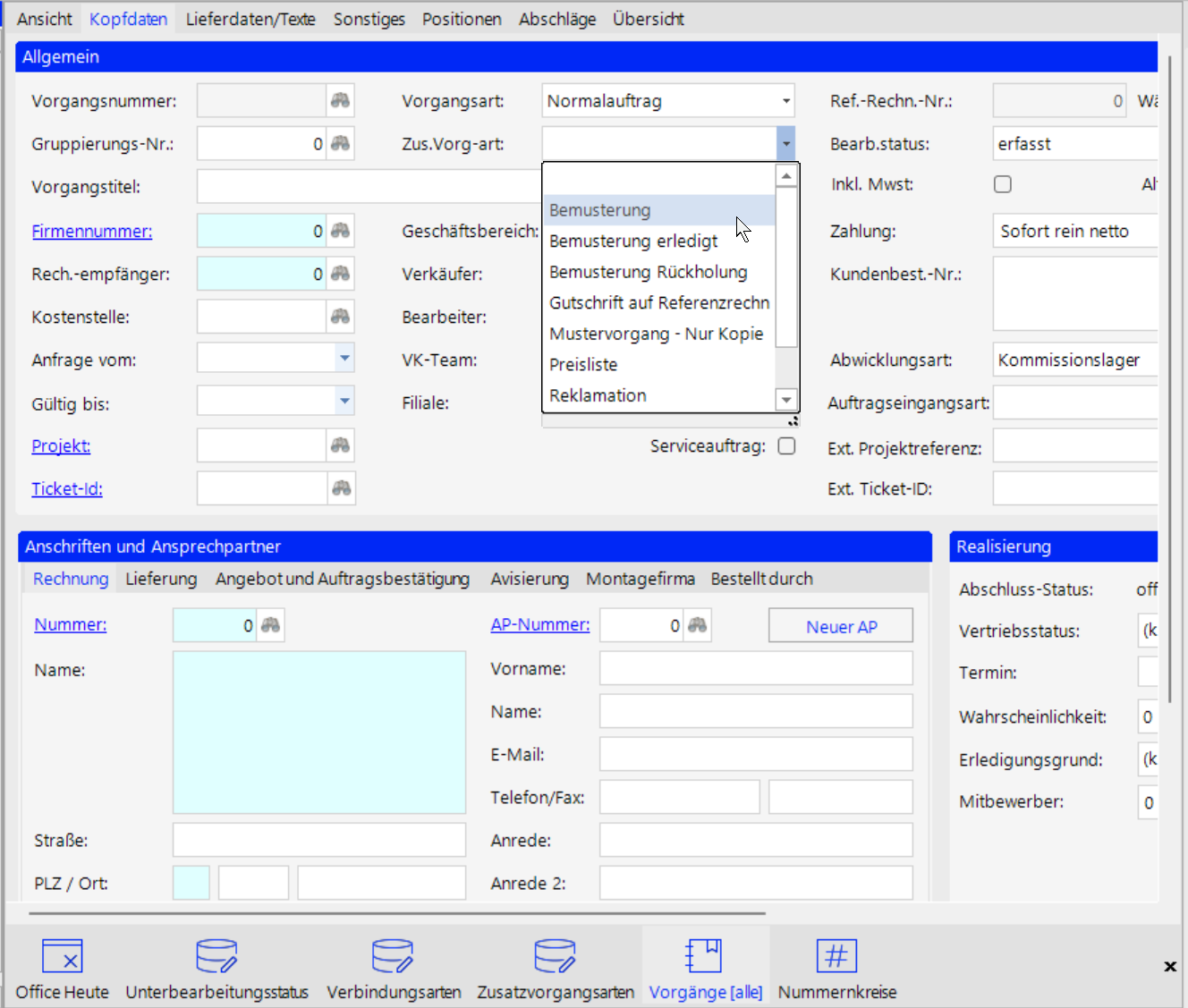 Zusätzlich kann eine ZV dem Vorgang weitere Einstellungen diktieren, wie zum Beispiel eine Fakturasperre oder eine Ausnahme von der Auftragseingangsstatistik.