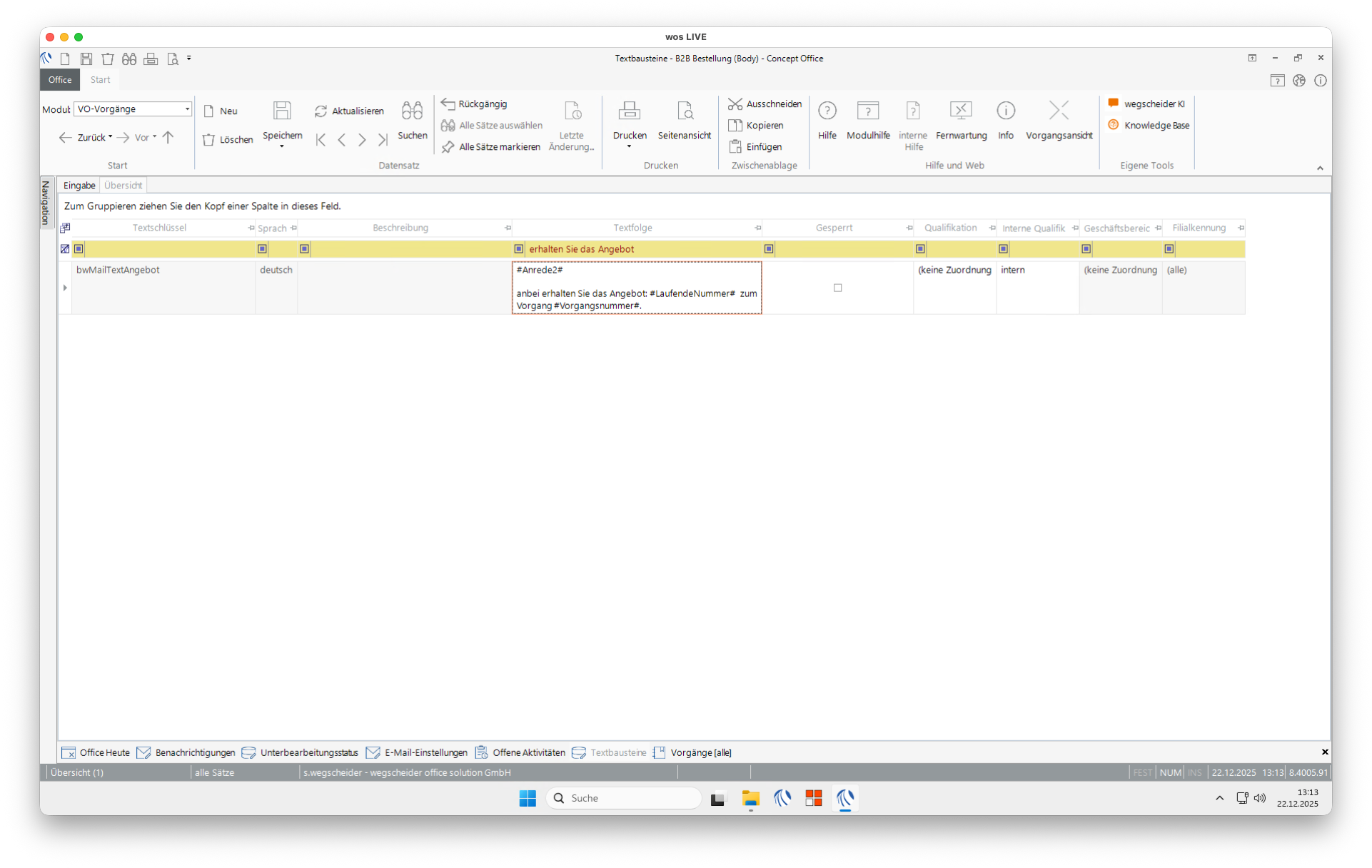 Textbausteine werden an verschiedenen Stellen im Programm verarbeitet. Befinden Sie sich beispielsweise im Vorgangsmodul, basieren die Texte in den Kopf- und Fußtext auf Textbausteinen.