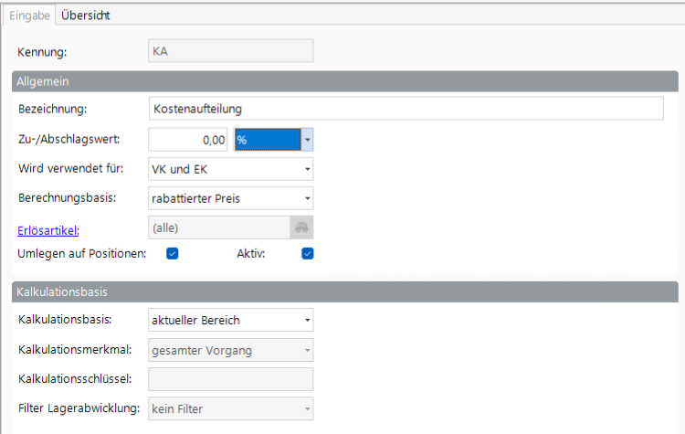 Sie entscheiden, ob der Betrag anteilig auf Positionen umgelegt oder auf einen Erlösartikel gebucht werden soll. Mit dem Schalter „Aktiv“ können Sie Zu- und Abschläge bei Bedarf temporär deaktivieren, ohne sie zu löschen:
