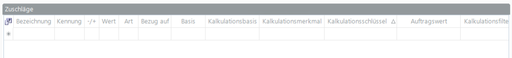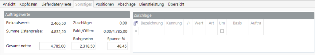 Die erfassten Zu- und Abschläge können Sie in der Vorgangsbearbeitung, Registerkarte „Sonstiges“, im Abschnitt „Zuschläge“ auswählen. Dort ist es möglich, bestehende Einträge zu übernehmen und bei Bedarf Werte oder Prozentsätze individuell anzupassen: