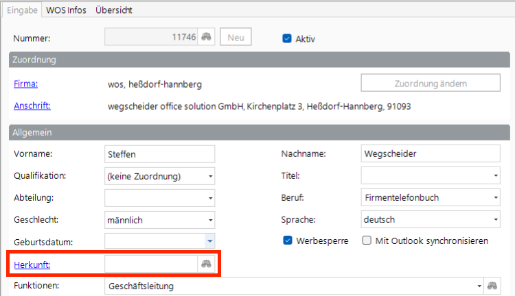 Im Firmen-Modul (Reiter Eingabe) können Sie eine Aktion über das Feld "Herkunft" hinterlegen: