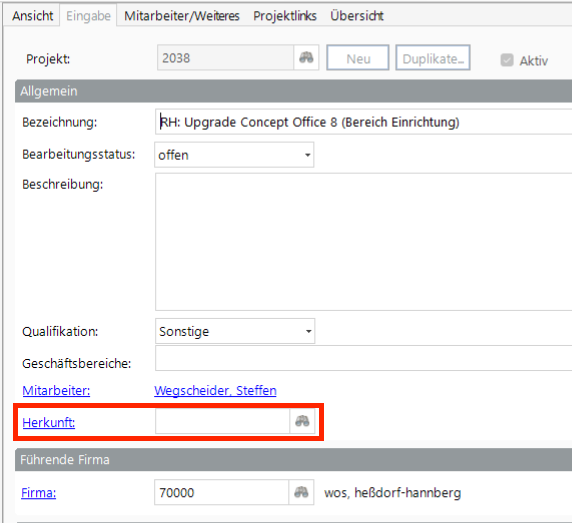 Im Projekte-Modul (Reiter Eingabe) können Sie eine Aktion über das Feld "Herkunft" hinterlegen: