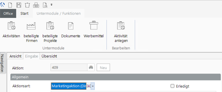 Im Modul Aktionen werden Vertriebs- oder Marketingaktionen erfasst und zentral verwaltet. Diese dienen der Gruppierung und Bearbeitung von Firmen, Ansprechpartnern oder Interessenten, die im Rahmen einer Kampagne oder Aktion gemeinsam bearbeitet werden sollen. Dabei kann jede Aktion einer bestimmten Aktionsart zugeordnet werden. Die Aktionsarten selbst werden über das Modul „Aktionsarten“ definiert und bieten die Möglichkeit, mehrere Aktionen thematisch zu bündeln (z. B. Kundenrückgewinnung, Neuproduktvorstellung, Messekontakte). Typische Einsatzbereiche: