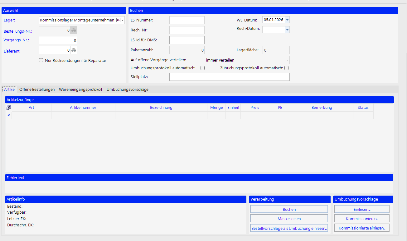 Artikel: Hier können Warenbewegungen gesteuert, also Artikel zu-, ab- oder umgebucht werden.