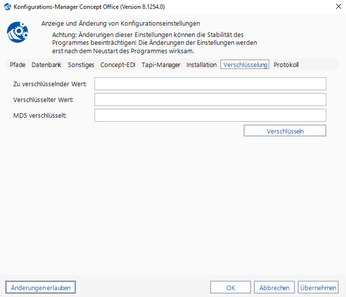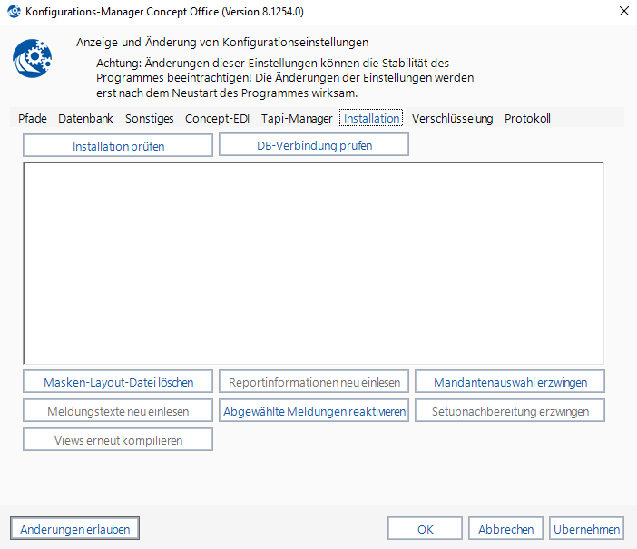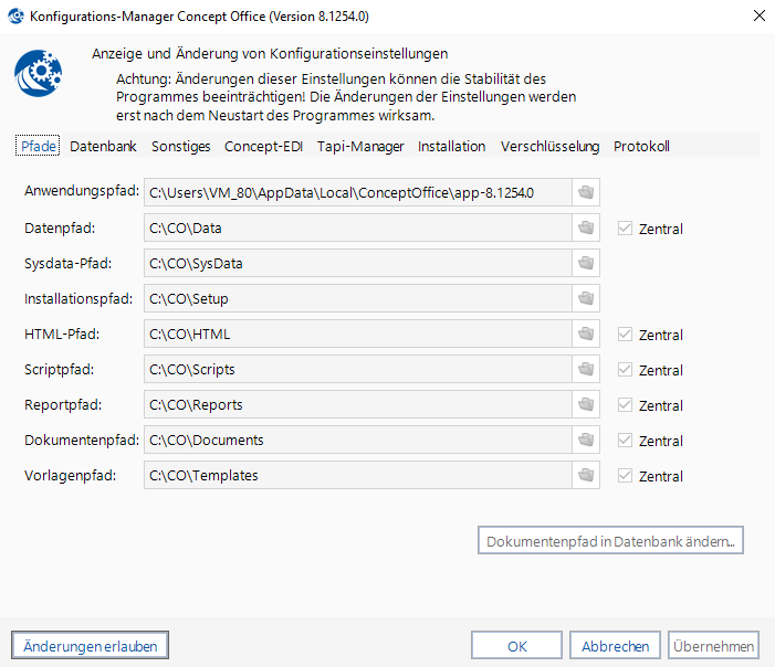 Das Modul zeigt zentrale und nutzeranhängige Programmeinstellungen von Concept Office.
