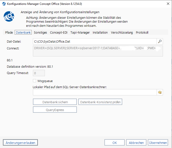 Im Feld Connect wird der Verbindungspfad (Connect-String) zur Datenbank von Concept Office angezeigt.