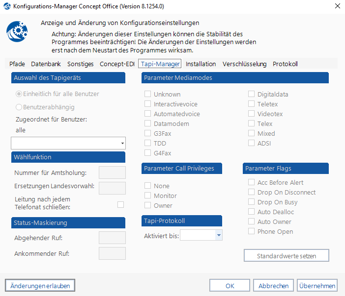 Standardwerte setzen: Die Einstellungen für Status-Maskierung, Parameter Mediamodes und Parameter Flags werden für die meisten TK-Anlagen mit diesem Knopf korrekt gesetzt und sollten nur nach Rücksprache mit unserem Support verändert werden.