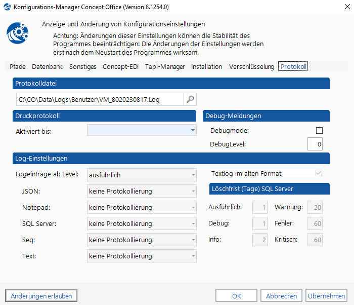 Zusätzlich besteht die Möglichkeit, im Bereich der Datenbank verschiedene Log‑Einstellungen vorzunehmen.