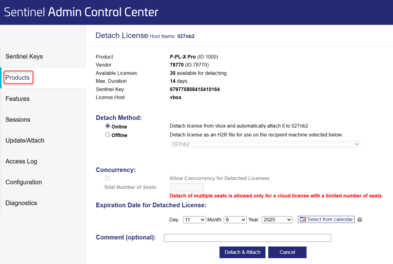 Durch einen abschließenden Klick auf 'Detach & Attach' wird die Lizenz zu Ihrem Rechner übertragen