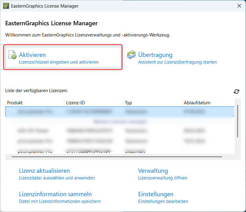 Um diesen Lizenzschlüssel zu aktivieren, öffnen Sie bitte die Lizenzverwaltung, gehen auf "aktivieren" und tragen dort den neuen Lizenzschlüssel ein.